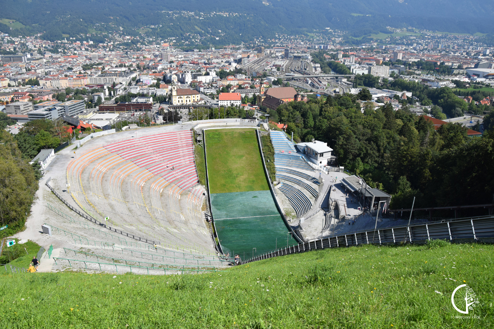 Około 20 km trasy do Innbrucka zapamiętuję, jako mało interesujący odcinek. Miało być tylko płasko tego dnia ale przecież nie bylibyśmy sobą, żeby nie poznęcać się trochę nad własnym ciałem. Podążamy więc w górę miasta pod skocznię Bergisel.