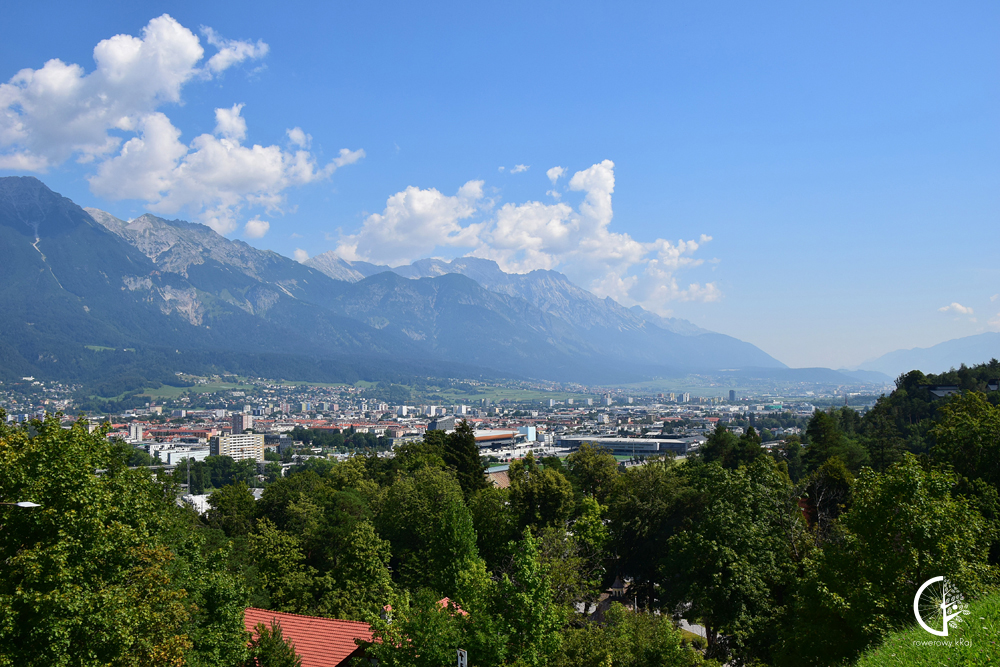 Żeby dostać się na skocznię (bilet wstępu 10 euro w 2020r.) wybieramy schody zamiast windy i delektujemy się roztaczającą z wysokości panoramą. Potem przemierzamy uliczkami miasta. Choć jest tu ładnie, bo stolica Tyrolu łączy w sobie fascynującą tradycję i nowoczesność, to jednak tłumnie. A to zawsze kończy się naszą ucieczką. Nie lubimy tłumnych, gwarnych miejsc. Kontynuujemy więc rowerową podróż pośród pól kukurydzy okalanych górami, co sprawia nam większą przyjemność aniżeli turlanie się pośród miejskiego gwaru.