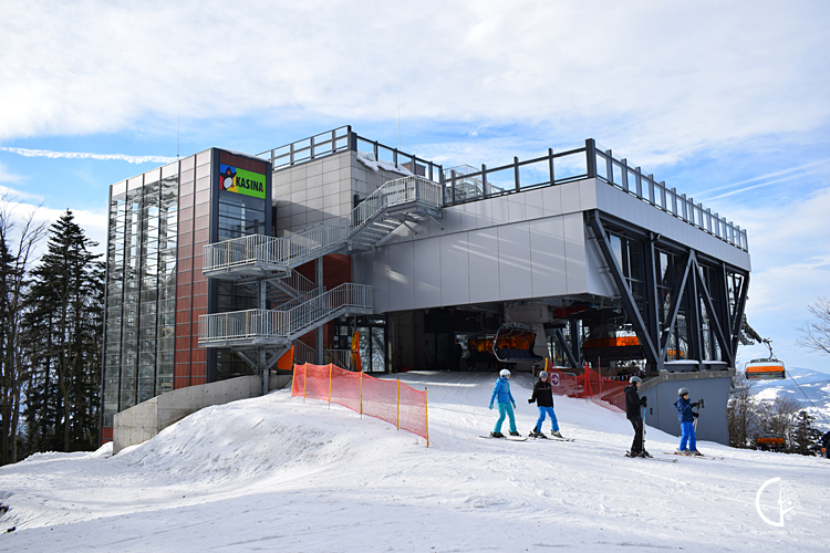 Przeglądając mapę wędrówki i rozglądając się na żywo w terenie, przez głowę przebiega myśl, że szlak będzie prowadził stokiem narciarskim. Myśl nie zawiodła, a oznakowanie szlaku zwiodło nas wprost do podnóża stoku. Nie będziemy najlepszym towarzystwem dla szusujących tu narciarzy, ale rzeczywistość nie daje nam wyboru. Dziwi jedynie fakt, że człowiek z dyżurki GOPR przekonuje nas, że nie ma tutaj żadnego niebieskiego szlaku i daje dobrą radę, by wjechać na górę wyciągiem za bagatela 18 PLN.