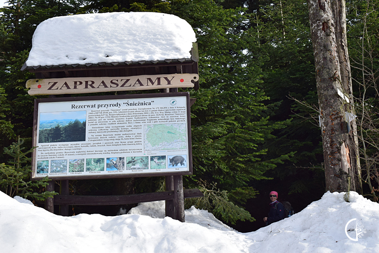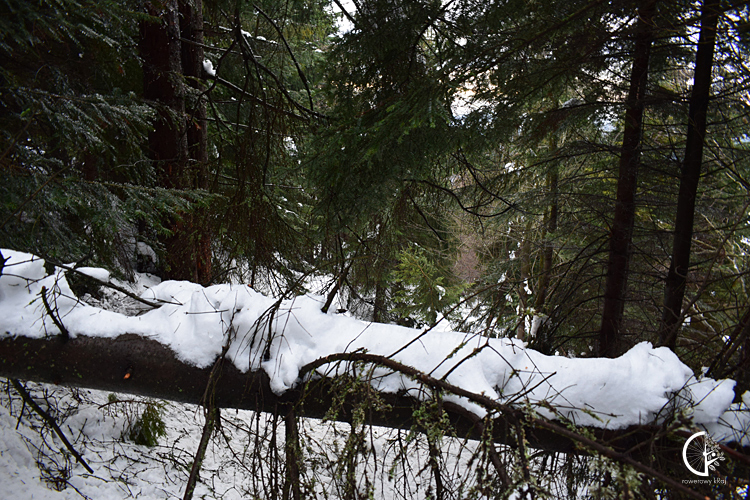 Osiągamy pułap stacji kolejki i kontynuujemy wędrówkę niebieskim szlakiem, który ścieżyną wprowadza nas w piękny jodłowy las. Tegoroczna zima zafundowała śniegu co nie miara. Już po pierwszych kilku metrach ląduje po kolana w zaspach. Idzie się ciężko, o czym nie daje zapomnieć łapiąca mnie zadyszka.