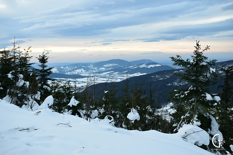 Jest kilka minut po 15-ej, kiedy zaczynamy podejście na Ćwilin. Wydeptana ścieżka rozmywa niedogodność i trud stromego podejścia. Każdy kolejne 100 metrów w górę to kilka centymetrów śniegu więcej. Każde kilka centymetrów śniegu więcej, to więcej zwalonych drzew. Więcej zwalonych drzew, to wydłużona o kolejne minuty wędrówka.