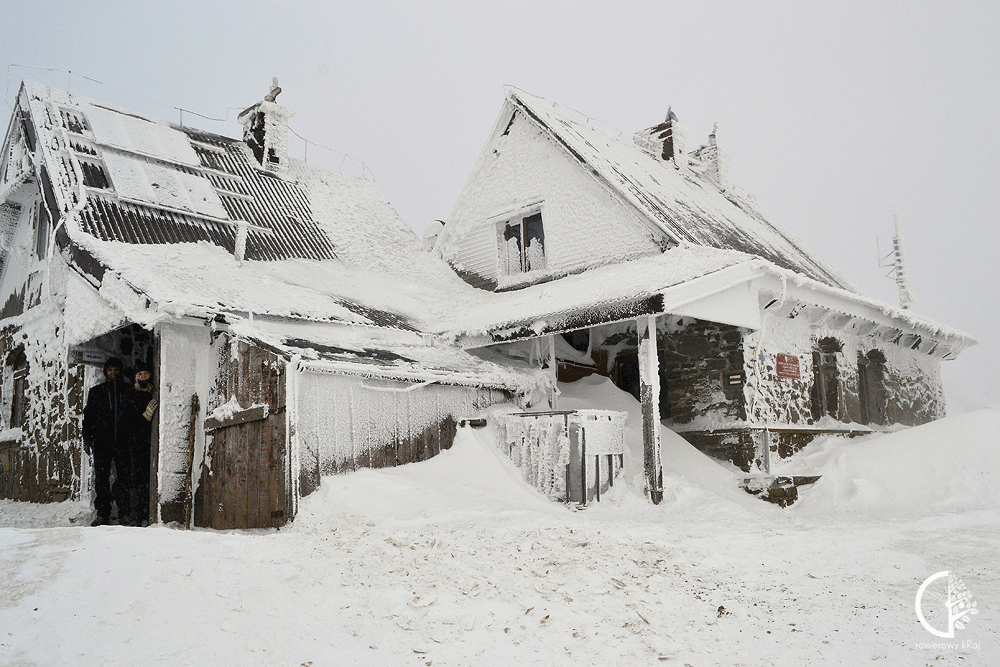 Udeptany tunel zaniknął, a drewniane balustrady okalające drogę zanikły gdzieś pod śniegiem. Niesione wiatrem zmrożone kryształki w mgnieniu oka zasypują ślady. Tylko wysokie tyczki pozostały drogowskazem. Brodzimy w śniegu wpadając niekiedy po kolana. Im wyższy osiągamy pułap, tym bardziej spada widoczność. Choćby chwilowe zdjęcie rękawiczek powoduje natychmiastowe skostnienie palców. W końcu osiągamy szczyt i znajdujemy schronienie w chłodnych murach schroniska Chatka Puchatka.