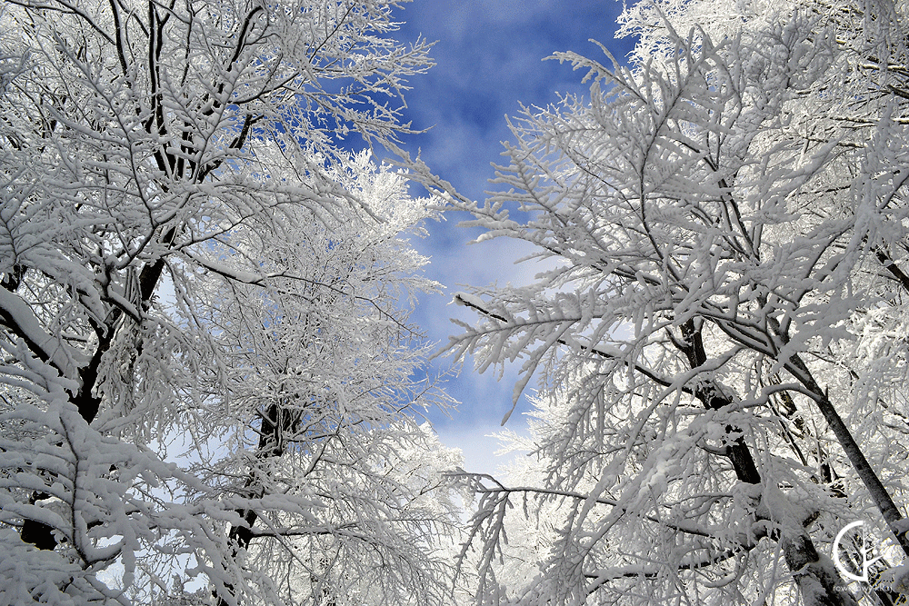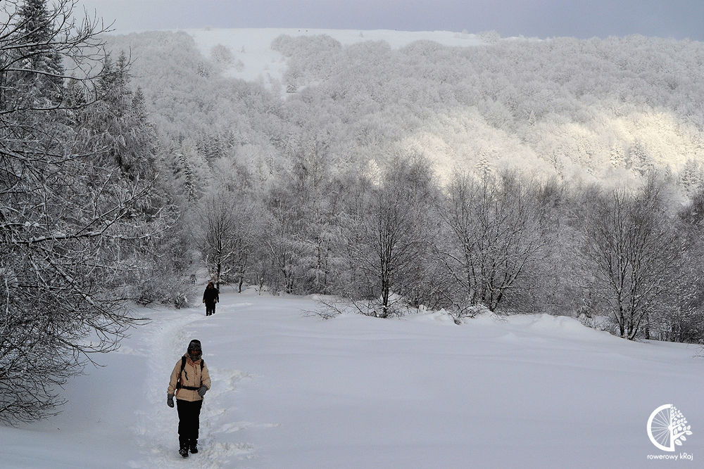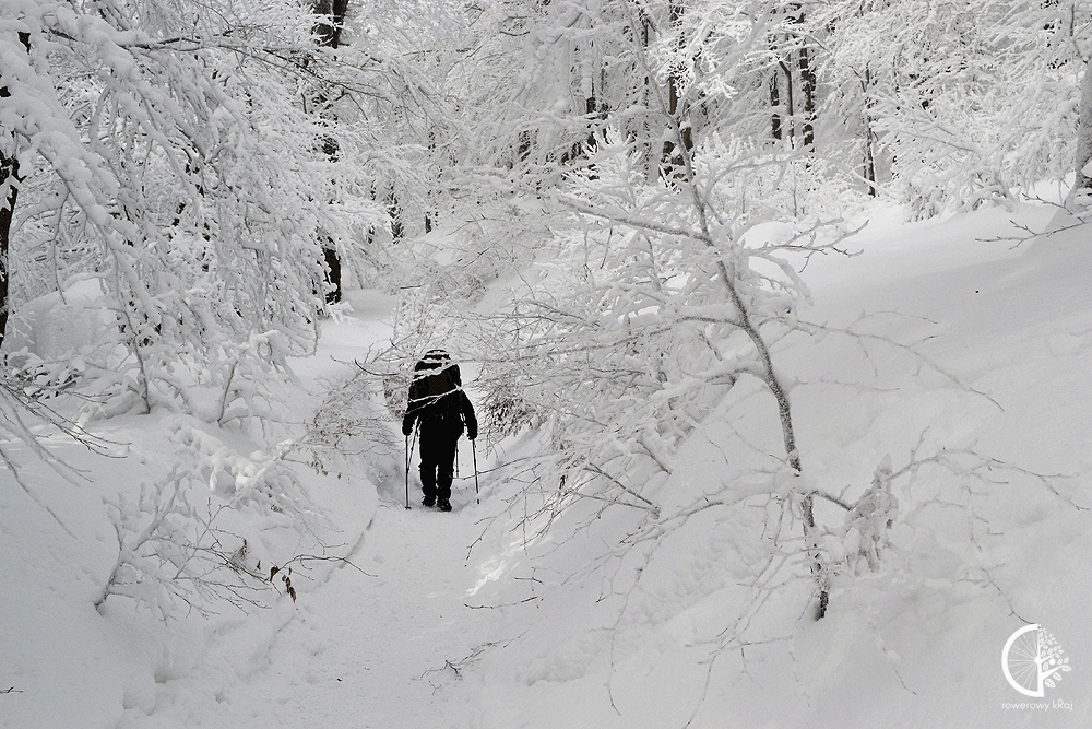 wiatr zostaje gdzieś za tymi niewidzialnymi drzwiami, a wokół nastaje bezruch powietrza. Pniemy się w górę białym tunelem, jaki utworzyły ośnieżone zbocza. Nad głowami zaklęte w mroźnym uścisku korony drzew, otulone białym puchem. Jest naprawdę baśniowo i chciałoby  się trwać w tej bajce. Dłuższe postoje przypominają nam jednak rychło, że jest prawdziwa zima. Dlatego równym krokiem maszerujemy wyżej. I choć ciałom naszym jest ciepło, to wszelkie sprzęty foto i video odmawiają posłuszeństwa. Aparat nie łapie ostrości, telefon szaleje i się wyłącza, kamerka sportowa, choć ładowana przed wyjściem, jest na wyczerpaniu. Dlatego fotograficznie, nie będzie się działo. Postaram słowami oddać klimat bieszczadzkiej zimy.