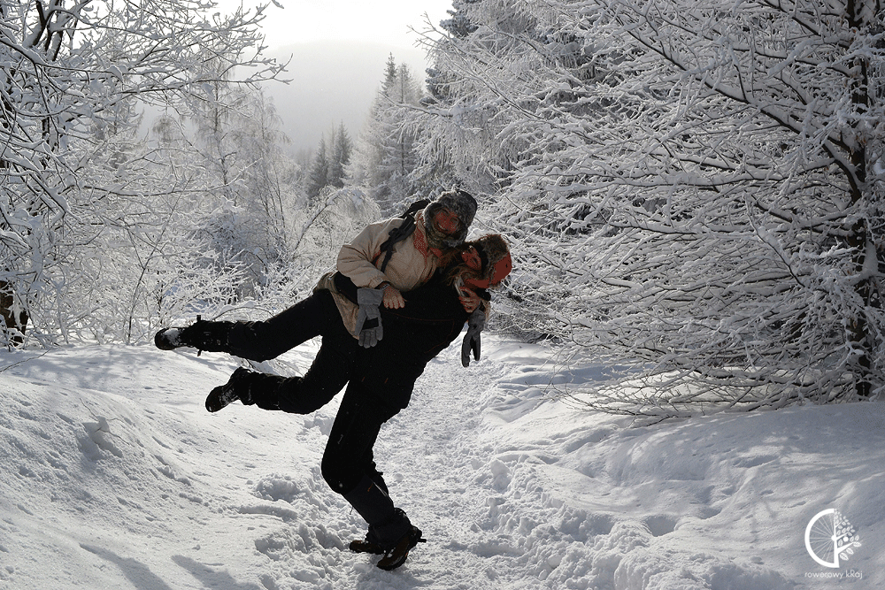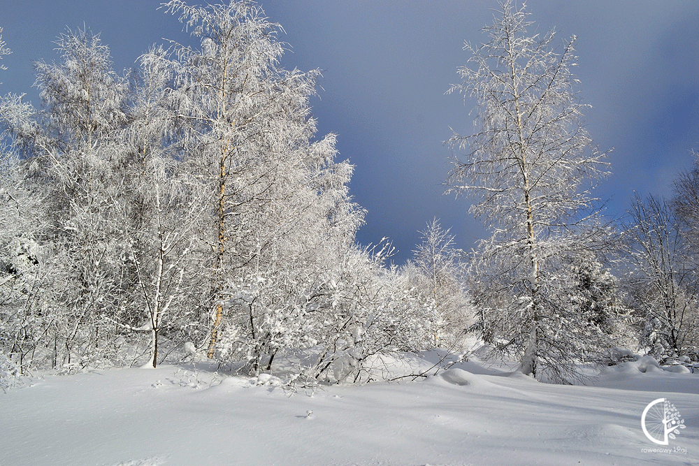 Piętnastominutowa przerwa na gorącą herbatę w zupełności wystarcza. Rozgrzane wysiłkiem ciało szybko się wychładza. Droga powrotna do świata pięknej, zimowej baśni jest łatwiejsza. Las powtórnie wita nas bezwietrzną ciszą. Otwieramy ponownie drzwi, za którymi puszysty śnieg nad głowami, promienie słońca muskające twarze, delikatność otaczającej przyrody.