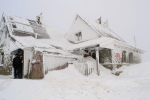 Udeptany tunel zaniknął, a drewniane balustrady okalające drogę zanikły gdzieś pod śniegiem. Niesione wiatrem zmrożone kryształki w mgnieniu oka zasypują ślady. Tylko wysokie tyczki pozostały drogowskazem. Brodzimy w śniegu wpadając niekiedy po kolana. Im wyższy osiągamy pułap, tym bardziej spada widoczność. Choćby chwilowe zdjęcie rękawiczek powoduje natychmiastowe skostnienie palców. W końcu osiągamy szczyt i znajdujemy schronienie w chłodnych murach schroniska Chatka Puchatka.