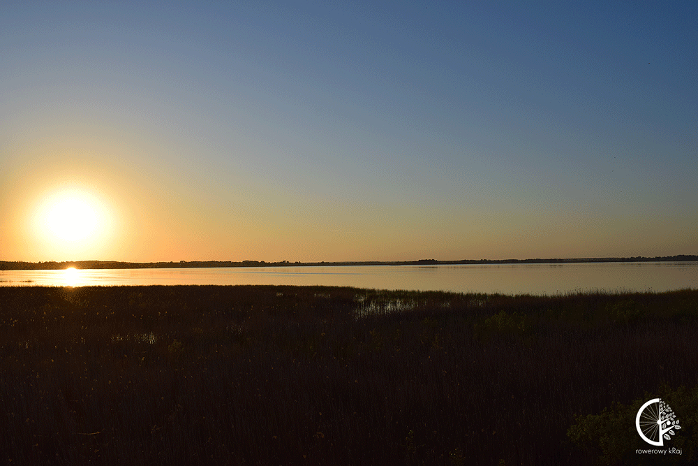 Od tej pory szlak prowadzi w bezpośrednim sąsiedztwie Śniardw. Roztaczające się panoramy z mijanych punktów widokowych i drewniane pomosty, nie pozwalają przejechać obojętnie. Zatrzymujemy się choćby na chwilę, próbując utrwalić krajobraz na fotografiach. Te jednak nie oddadzą rzeczywistych barw, zapachów, dźwięków i emocji nam towarzyszących. Złota godzina przychodzi, kiedy delektujemy się brzmieniem ciszy siedząc na pomoście w miejscowości Suchy Róg. Ta magiczna chwila zapadnie głęboko w pamięci, podobnie jak wszystko co będziemy pochłaniać wzrokiem, chwytać nozdrzami, szpiegować uchem i odczuwać wszystkimi zmysłami na ostatnich kilometrach drogi. Pagórkowaty teren, ptasi koncert, błękitna tafla jeziora, szept lasu, bagienna woń rezerwatu Stary Czapliniec. Nawet uciążliwy bruk odchodzi w zapomnienie, kiedy z wieży widokowej nad jeziorem Łuknajno patrzymy na pomarańczową poświatę otulającą ziemię.