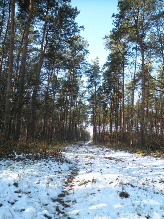 Okalające wioskę lasy oraz znikomy ruch samochodowy pozwoliły na dłuższe zatrzymanie zimy na tutejszej drodze. Poruszam się jak po szachownicy. Raz białe pole, raz czarne. W końcu dokręcam do ściany lasu. Spodziewałam się białej ślizgawki, a przywitała mnie całkiem czarna szutrowa droga. Najwyraźniej pośród strzelistych, majestatycznych świerków dukt nie zdążył się zabielić. Latem na trakcie tym nie sposób nie spotkać rowerzysty. Dzisiaj jestem tylko ja i wszechogarniająca leśna cisza przerwana na chwilę trzepotem ogromnych skrzydeł lądującego na gałęzi jastrzębia.