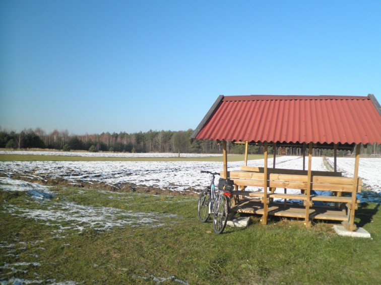 Żegnam się z zimową aurą i dolatuję do miejscowości Kurzacze, cały czas kierowana dobrze oznakowanym na tym odcinku żółtym rowerowym szlakiem.  Tu jakby panowała inna pora roku. Rozległe pola i łąki skąpane są w pełnym słońcu. Na asfaltowej drodze po śniegu ani śladu. Jedynie w bruzdach pól zalega jeszcze trochę białej szaty.