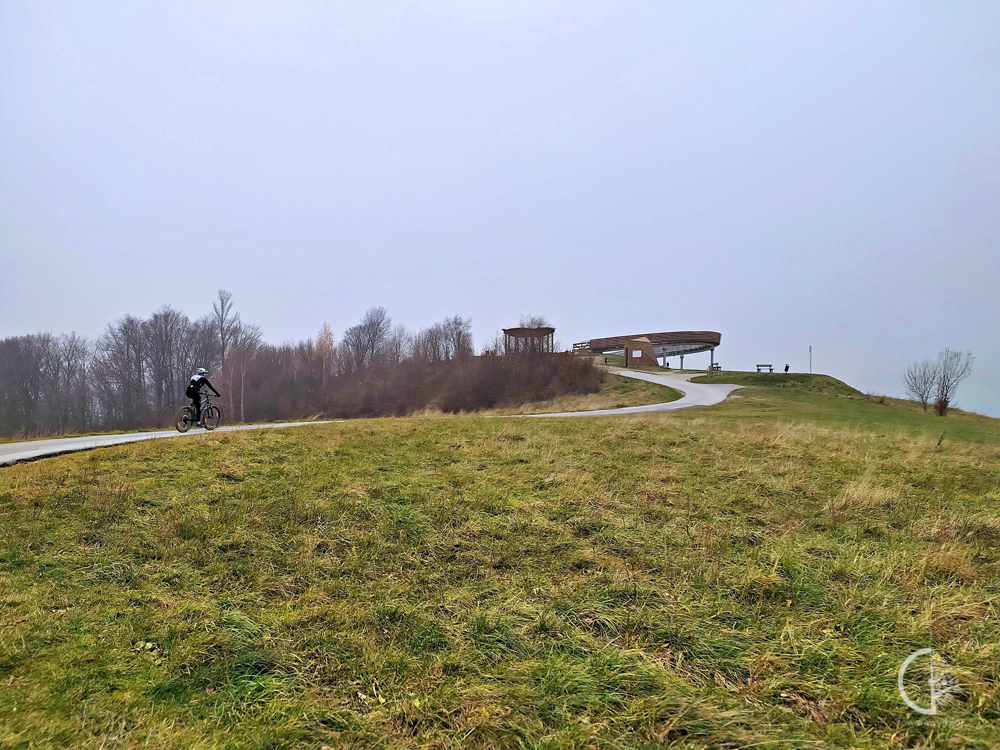 Z wysokości 322 m n.p.m. w pobliżu koryta rzeki zaczynam podjazd. To droga asfaltowa więc szeroka, terenowa opona niemal wgryza się w asfalt. Na odcinku 3 kilometrowego podjazdu pokonujemy 200 m przewyższenia. W położonej tu miejscowości Wola Krogulecka, na wzgórzu Dzielnica znajduje się platforma widokowa. Nie jest to jednak zwyczajny punkt widokowy z wybudowaną wieżą, a charakteryzująca się swym spiralnym kształtem platforma. Ze względu na swój osobliwy kształt platforma widokowa w Woli Kroguleckiej nazywana jest „Ślimakiem”.