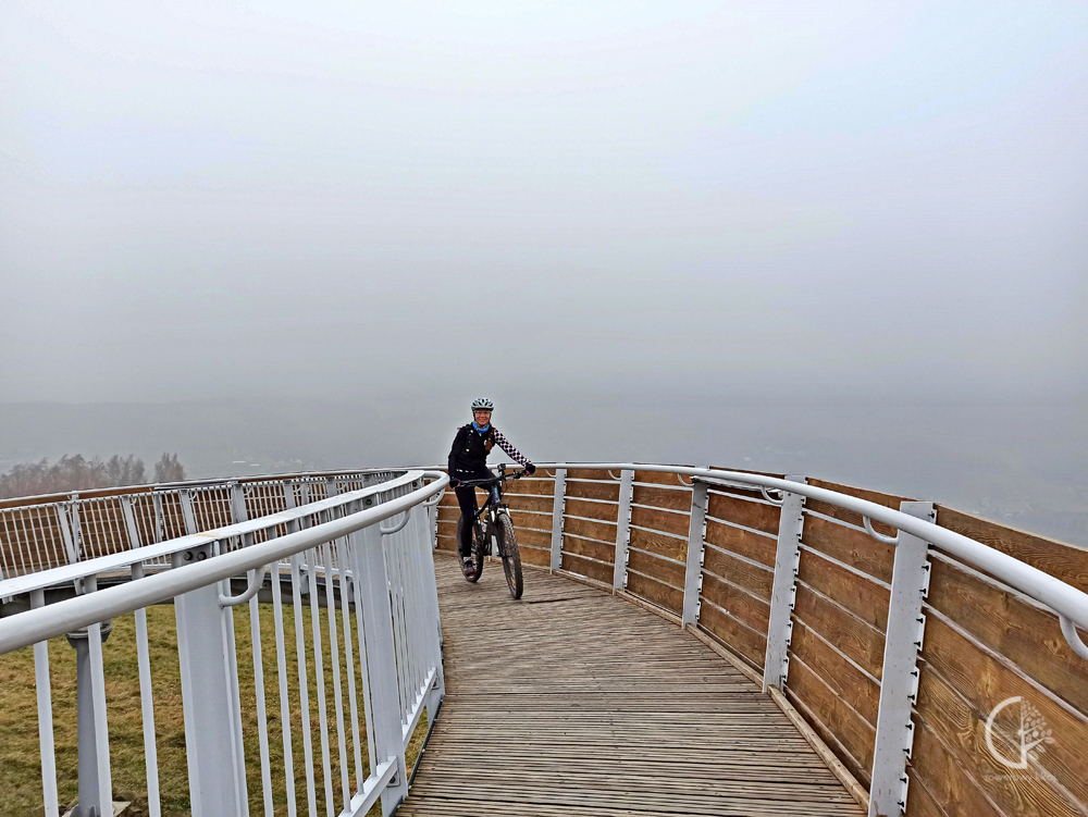 Platforma znajduje się na otwartej przestrzeni, na wysokości ok. 530 m n.p.m., ok. 200 m nad doliną rzeki Poprad. Ponoć pozwala na podziwianie widoków na Beskid Sądecki, szczególnie Pasmo Radziejowej, Kotlinę Sądecką, Gorce i Beskid Wyspowy.My doświadczamy widoku mgły. I nawet już przeciwległy Połom z charakterystycznym sobie wiatrakiem, z którego dostrzegliśmy miejsce, w którym właśnie się znajdujemy, skrywa się przed naszym wzrokiem.