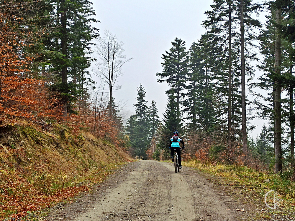 Pierwsze ruchy korbą to uczta dla duszy. Przyjemna ścieżka, piękny las, w dole toczy się w swym korycie Poprad. Ścieżka jednak robi się coraz bardziej wąska, coraz więcej w niej wystających korzeni a wysokość dzieląca nas od koryta rzeki coraz wyższa i bardziej stroma. Sprawy nie ułatwia wszechobecna wilgoć i zalegające na ścieżce liście. W końcu jest połowa listopada. Nazwa miesiąca zobowiązuje i opad z listowia robi swoje.