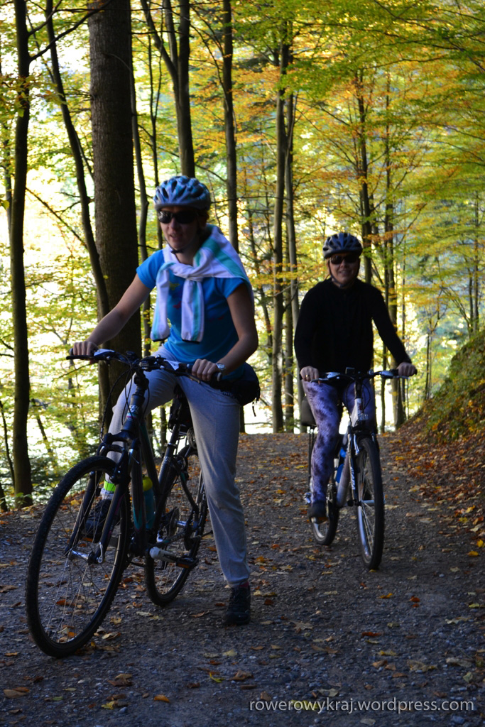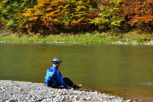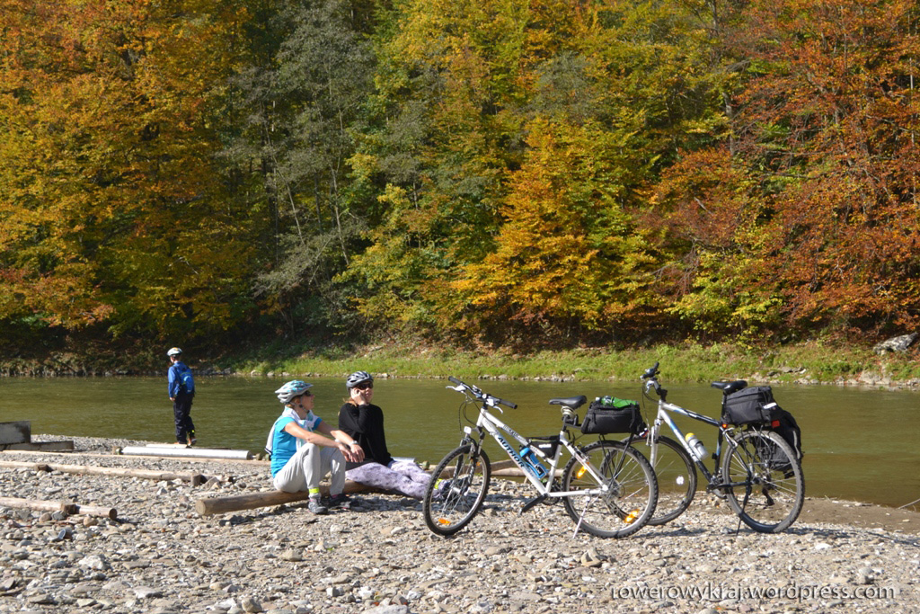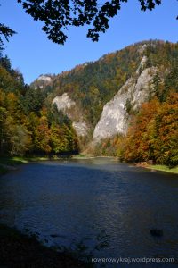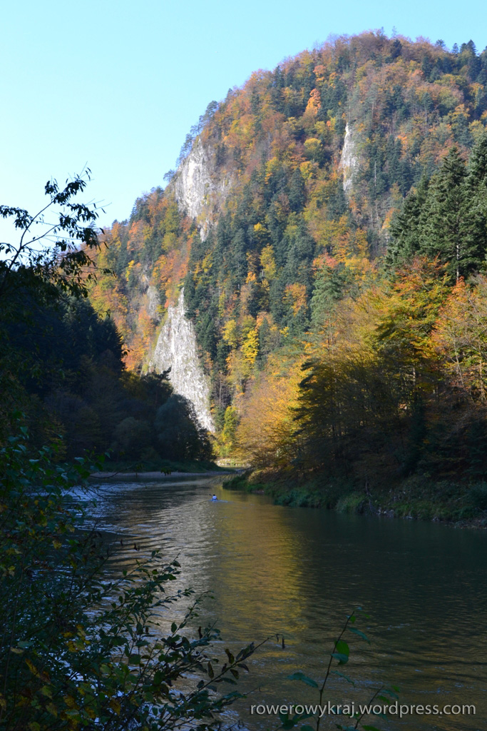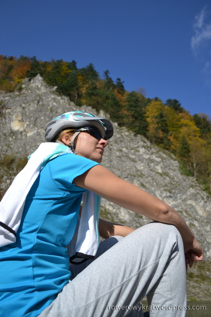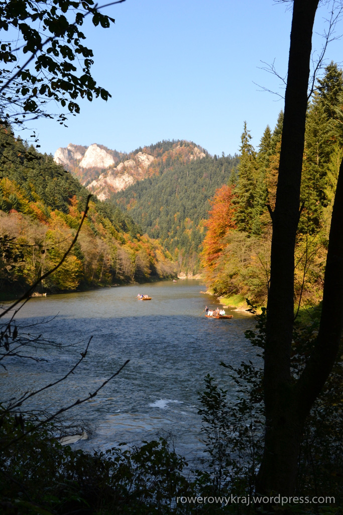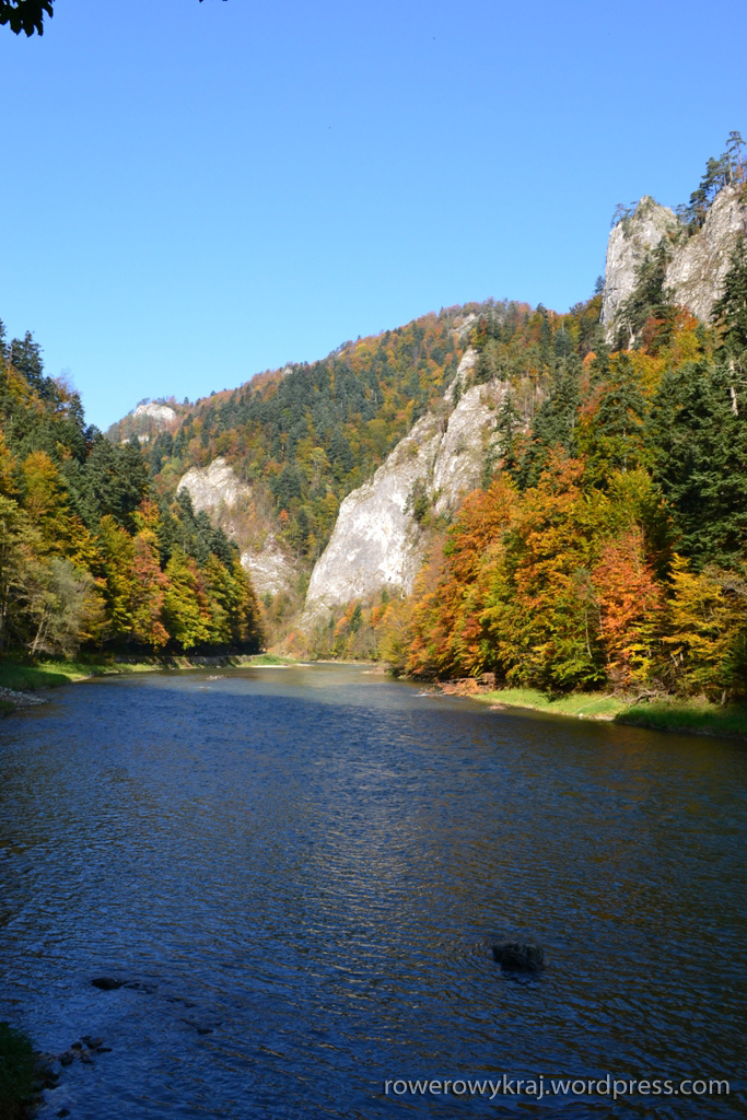 Co jakiś czas widzimy tabliczki informujące, że na danym odcinku należy zsiąść z roweru. To pewnie ze względów bezpieczeństwa, bo niekiedy ścieżka przebiega przy samej rzece, bądź na stromych wysokich nasypach tuż nad jej nurtem, upadek z których mógłby się zakończyć naprawdę przykro. Ale mimo tych miejsc, gdzie trzeba zachować większą ostrożność i wykazać się rozwagą, nie ustawiono szpecących barierek, które pod pretekstem naszego bezpieczeństwa nabiły by komuś kabzę, a zapewne zeszpeciły uroki trasy. Kto zaś znaki lekceważy, to zapewne do pierwszego mandatu za ich nieprzestrzeganie. Kilkadziesiąt, a może nawet kilkaset euro mniej w kieszeni, uczy szybko zachowania ostrożności w tych miejscach. Perspektywa zubożenia naszych kieszeni powoduje, że grzecznie opuszczamy siodełka zgodnie z nakazami, mimo że na szlaku jest pusto. Z mojej obserwacji wynika, ze zagrożenie raczej dotyczy miesięcy, gdy piesi i rowerzyści tłumnie wylegają na szlak. Wtedy robi się dość ciasno i o zderzenie tudzież niefortunny upadek kończący się kąpielą w Dunajcu nie trudno. W październikowy czas, mimo że pogoda jest cudowna, ścieżkę mamy niemal tylko dla siebie. Po drodze, która liczy sobie ok. 10 km mijamy zaledwie kilku rowerzystów. Rozkoszując się widokami, zatrzymujemy się co rusz na pstryknięcie foto. Przebarwione liście drzew, pojedyncze tratwy sunące po rzece, cisza i tylko gdzieś tam na szczycie Sokolicy sylwetki ludzi patrzących zapewne na ten sam Dunajec, tylko i z innej perspektywy. My też mamy zamiar poznać piękno Pienin z ich szczytów, kolejnego dnia.