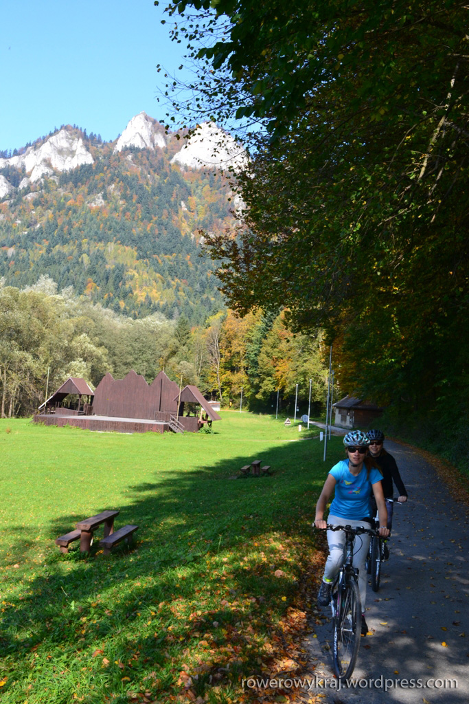 Jest wrzesień roku 2014. Przelotem jestem z wycieczką w Pieninach zaznawać jednej z największych tutejszych atrakcji – spływu Dunajcem. Moją uwagę przyciąga nie mały ruch rowerowy i pieszy na szutrowej dróżce biegnącej wzdłuż Dunajca. Flisak tłumaczy, że to trasa pieszo-rowerowa mająca swój początek w Szczawnicy, a potem biegnącą po ziemiach naszych słowackich sąsiadów do Czerwonego Klasztoru. Szepczę do koleżanki, że właśnie postawiłam sobie jeszcze jeden podróżniczo-rowerowy cel na ten rok, wskazując na trakt. Mija niespełna miesiąc i w towarzystwie Luka i bliskich mi trzech osóbek ruszamy na kilka słonecznie zapowiadających się październikowych dni w Pieniny. Zabieramy rowery oczywiście. Na bazę wypadową wybierany Krościenko nad Dunajcem. Byłam tu wieki temu z wycieczka szkolną. Z wyjazdu tego nie pamiętam za wiele, ale chyba wówczas podobało mi się to miejsce. Rzuciłam okiem na mapę i kierując się właściwie tylko tą „logiką” – prastarym wspomnieniem i dobrą bazą wypadową na szlaki górskie, dokonałam wyboru tego właśnie miejsca. Znaleźliśmy odpowiednią dla siebie kwaterę, o czym mogliście się już przekonać czytając wpis o cioci Krysi i rozpoczęliśmy naszą przygodę pośród dróg, dróżek i pienińskich rozdroży.