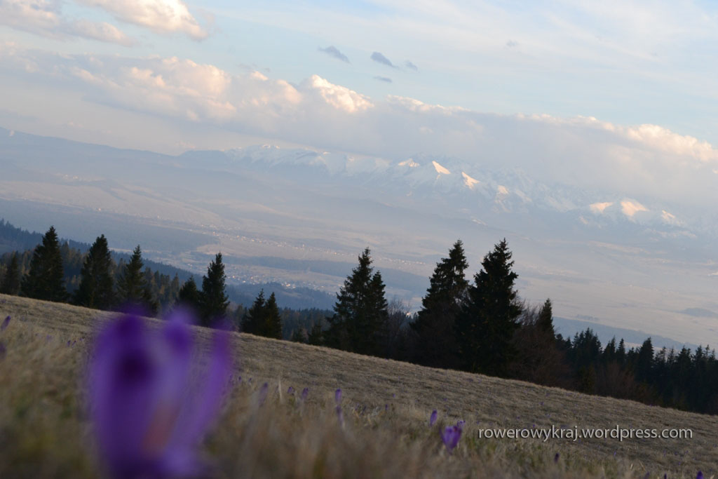 Zejście było nieco prostsze i szybsze (zmieściliśmy się w 3 h). Jednak dłuższe, niż oznakowanie wskazujące kierunek zielonego szlaku prowadzącego wprost na parking, na którym czekało auto. Pomimo rozbieżności czasowych i dość późnego wymarszu zdążyliśmy przed zmierzchem. Choć ten w ostatnie dni marca zapada dość szybko. Wędrówka niebieskim szlakiem w niknących promieniach słońca to sama przyjemność. Więcej tu otwartych przestrzeni, w tle ośnieżone szczyty Tatr spowite pomarańczową poświatą zachodzącego słońca. No i rzecz jasna krokusy! Które w większości pozamykały już swe kielichy układając się do snu.