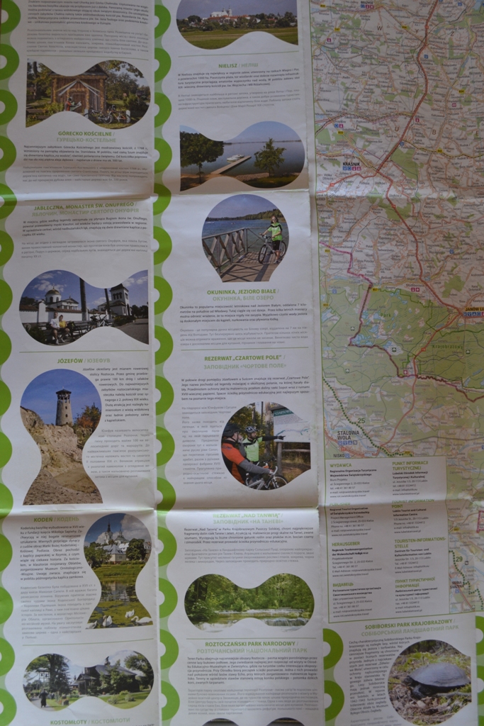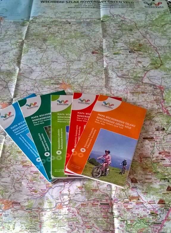 Promocja szlaku w roku 2015 obfitowała w liczne możliwości otrzymania map. Targi rowerowe, turystyczne, podróżnicze. Wszędzie stoiska promujące wschodni szlak rowerowy oferowały mapy dedykowane Green Velo, przygotowane specjalnie pod projekt, opracowane przez wydawnictwo EuroPilot. Takim oto sposobem mapy GV dorwaliśmy my. Jedna mapa obejmująca cały szlak Polski wschodniej i 5 kolejnych, dla każdego województwa odrębnie.