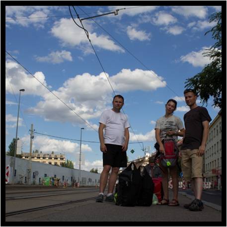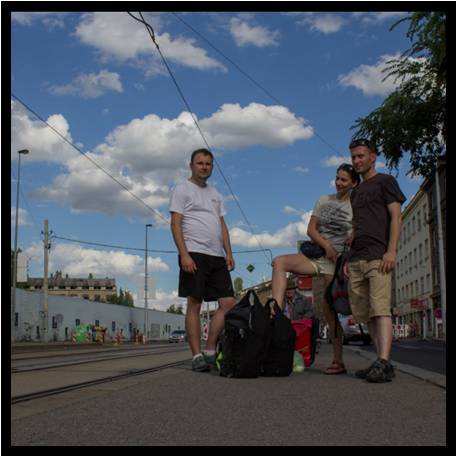 Sprzyjający nam los poukładał nam wszystko pięknie do czasu, kiedy z sakwami w rękach (rowery czekają rozczłonkowane w busie na kolejny dzień) ruszamy na drugi koniec miasta, by zakwaterować naszą rowerową czwórkę w zarezerwowanym wcześniej hostelu Kolbenka. Bez większego problemu najpierw autobusem, później metrem docieramy do dzielnicy, w której mamy spędzić noc. Wychodzimy ze stacji metra ku blaskowi światła dziennego i rozglądamy się za hostelem. Nie widząc niczego przed sobą w otaczającym nas postindustrialnym krajobrazie co wskazywałoby na nasz cel, pytamy na ulicy. I zaczynamy najdłuższą podróż w poszukiwaniu hostelu, przemieszczając się tramwajem raz po raz w jedną lub w drugą stronę.