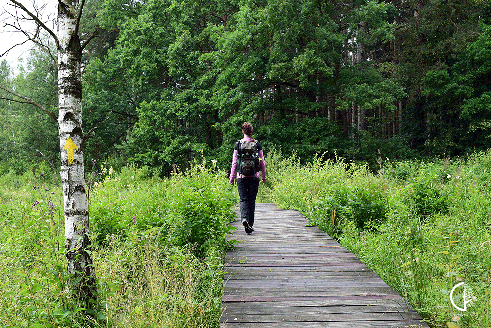 Zapach Puszczy Jodłowej wędruje do płuc. Oczy cieszą się na widok utworzonych z konarów młodych drzew zielonych korytarzy. W uszach wiruje ptasi śpiew. Gdy wychodzę na otwartą przestrzeń łąk ptaki milkną. Niebo zasuwa biały, mglisty woal chmur. Na twarzy lądują krople deszczu. Ich intensywność wzmaga się z każdą chwilą. Drewnianymi pomostami w biegowym kroku zmierzam do ściany lasu. Gęste korony drzew zatrzymują nieco opad a ja zatrzymuję się na chwilę, by zarzucić na grzbiet przeciwdeszczowe odzienie.