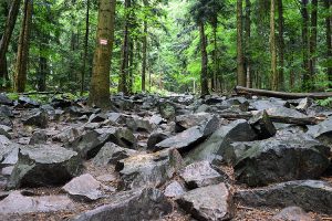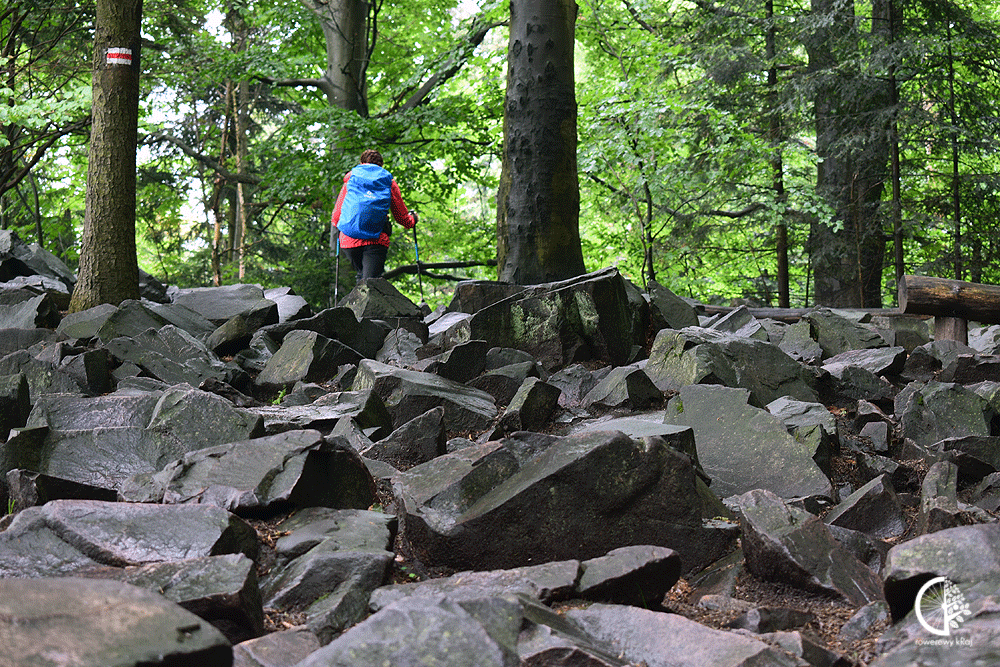 Wędruję dalej, a każdy krok przybliża mnie do szczytu Łysicy, zwanej także Górą Świętej Katarzyny. Na mokrych blokach skalnych ważę każdy krok. Bo choć nie ma tu stromych podejść, to nie trudno o skręcenie nogi pomiędzy śliskimi głazami (właśc. rumosz skalny), które na zboczach pasm Gór Świętokrzyskich tworzą tzw gołoborza.