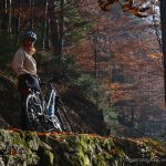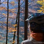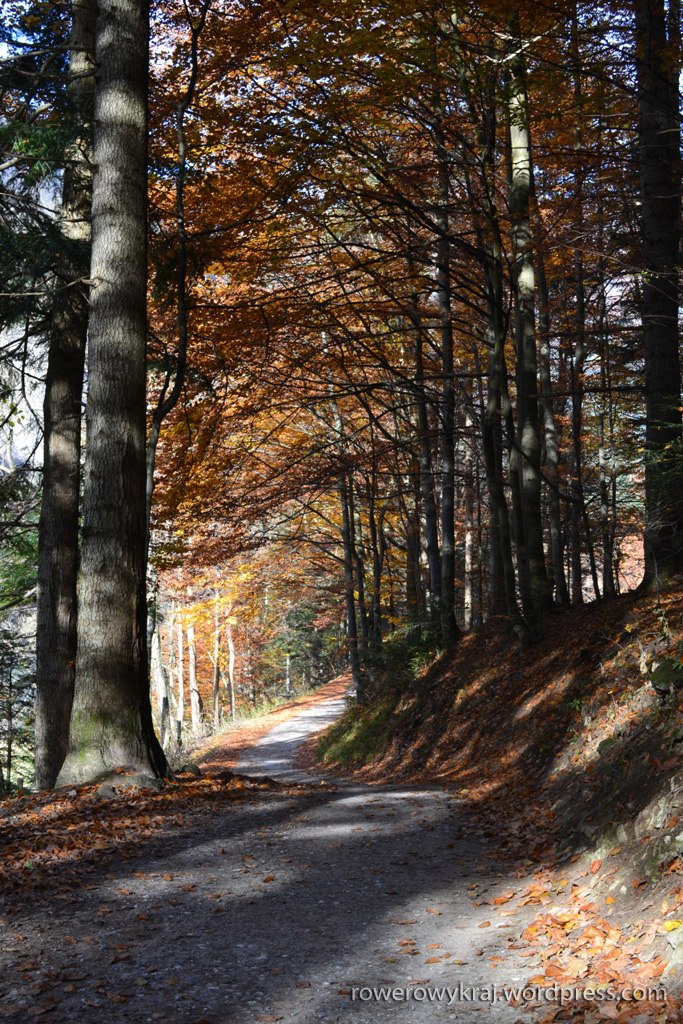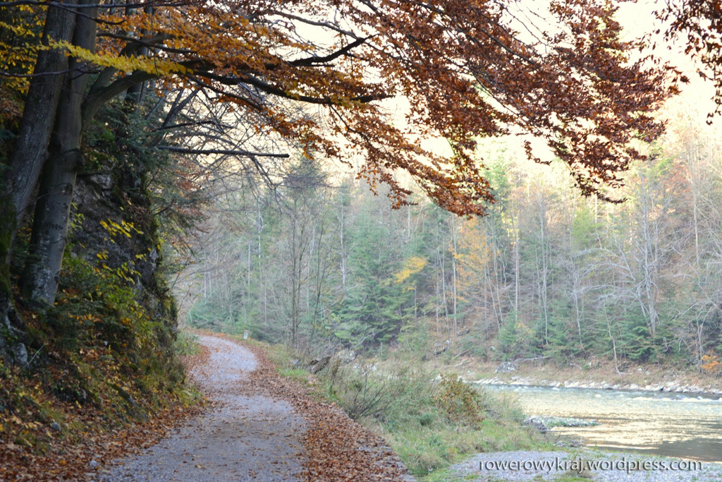 Liście leżą wszędzie dookoła, ale nie leżą bezpośrednio na naszej drodze. Trasa jest uporządkowana i dobrze oznakowana. Nie ma żadnych szpecących barierek, nawet w ciasnych wąwozach, na stromych i wysokich nasypach tuż nad nurtem rzeki. Są za to w tych miejscach tabliczki, nakazujące zejście z roweru. A nie przestrzeganie nakazów grozić nam może nie niską karą, tym bardziej że ukarać zostać możemy w europejskiej walucie.