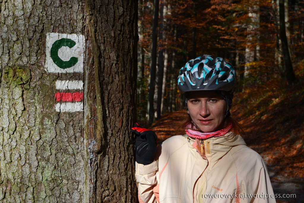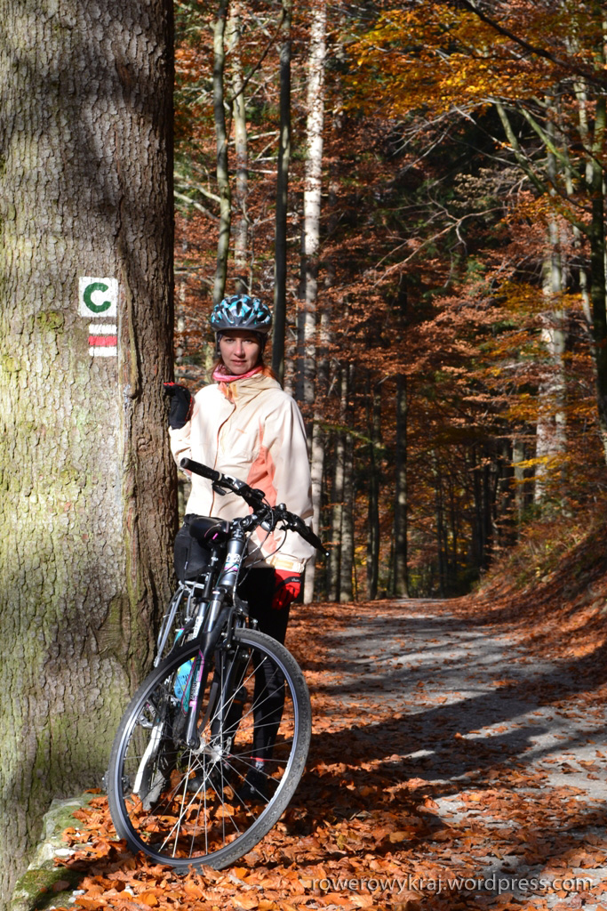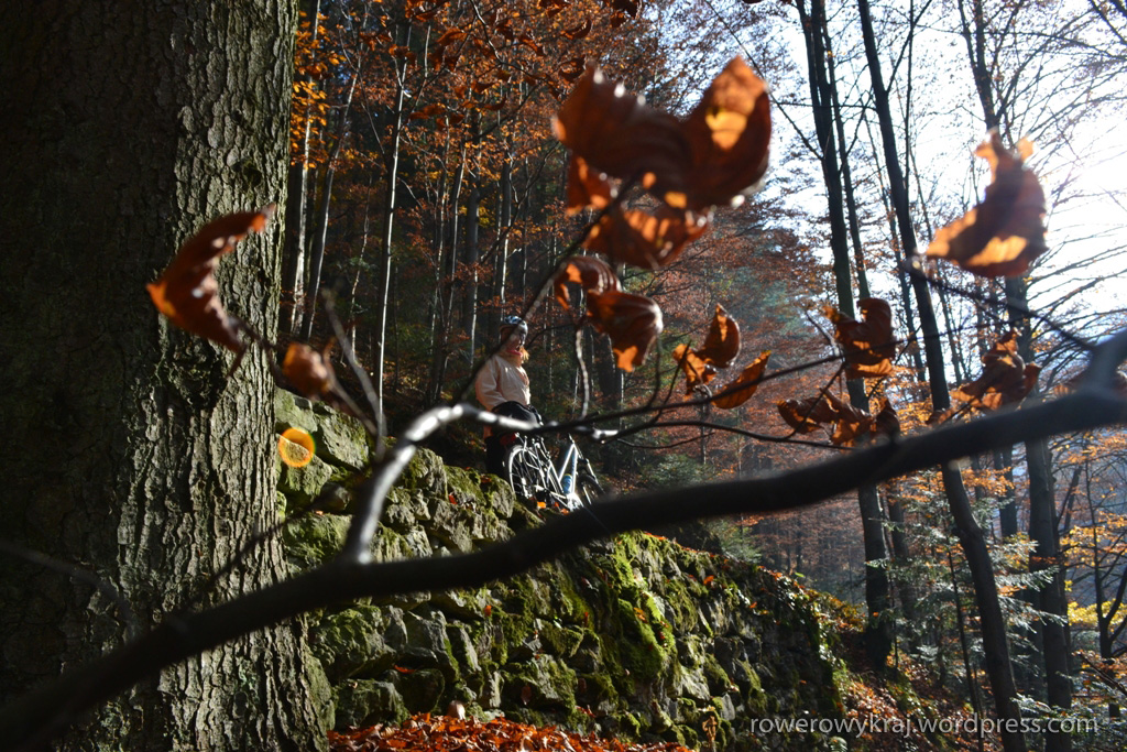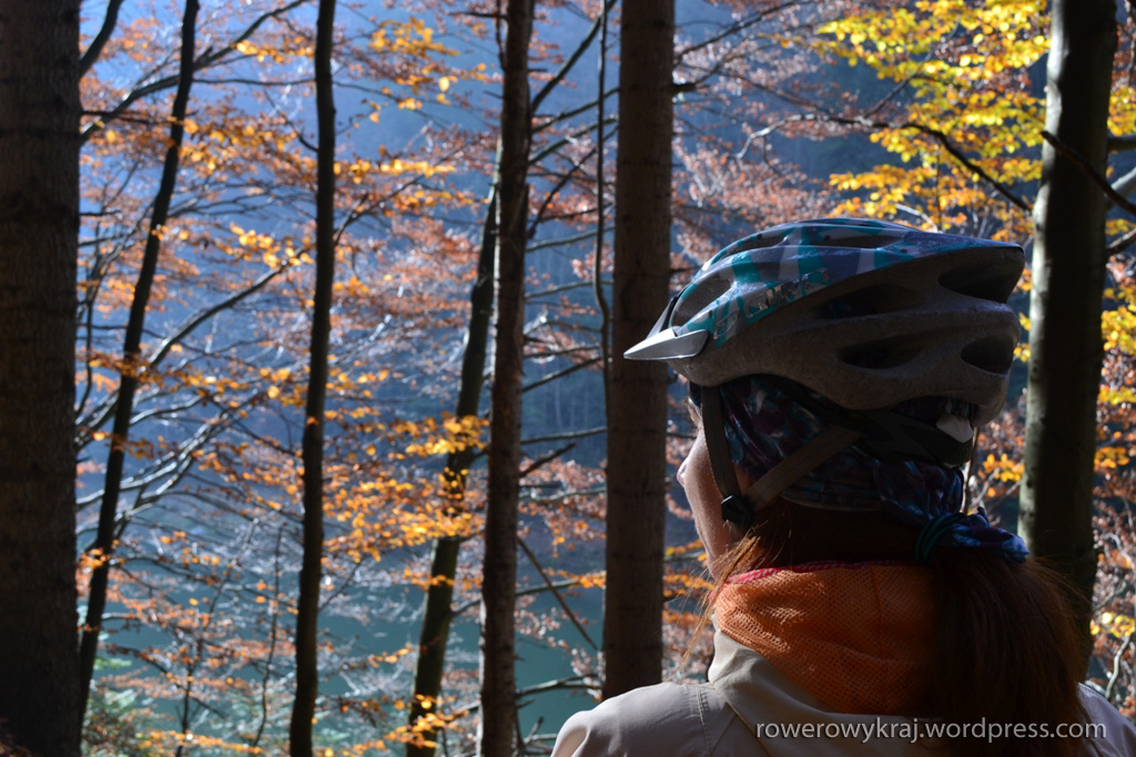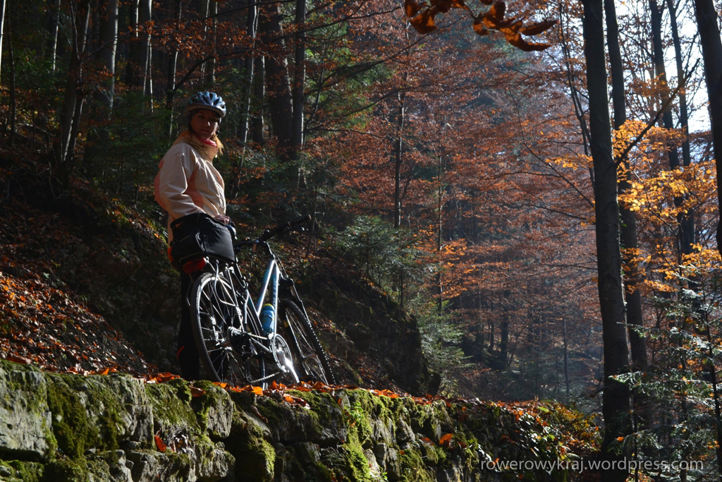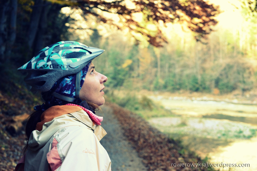 Gdy tylko wjeżdżamy w zacienione odcinki szlaku, chłód powietrza ostro uderza nas po twarzach. Jest to jednak przyjemny „policzek”. Ruszamy, a pod naszymi oponami szeleszczą ubarwione liście. Tu i ówdzie łaty szronu upominają nas, że musimy zachować ostrożność. Mokre liście, a pod nimi gdzie nie gdzie przyłapane przymrozkiem kałuże, mogą być przyczynkiem do nie lada niespodzianki. Oj, nie chciałabym wylądować na glebie, nie mówiąc już o bystrym Dunajcu! Brrrr!