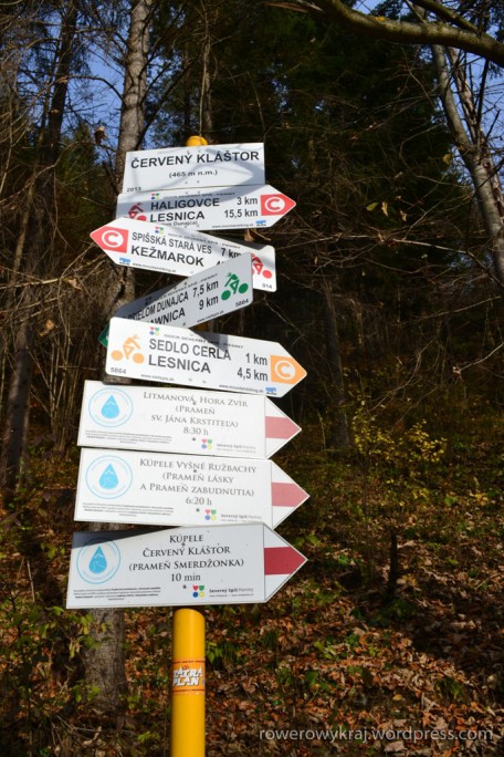 Naszym pośrednim celem w drodze do punktu startu (Szczawnicy) jest Leśnica, trasa przez Haligovce. Kierujemy się zatem zgodnie z oznaczeniem, wypatrując na swojej drodze czerwonej literki „C”. Nie musimy wytężać nadto wzroku. Trasa jest bardzo dobrze oznakowana. Na przydrożnych drzewach, słupkach, przystankach, tam gdzie rozstaje dróg – wszędzie widnieje oznaczenie szlaku w odpowiednim kolorze. Mapa w ogóle nam nie jest potrzebna. Przy takim oznaczeniu można cieszyć oko krajobrazem, zamiast męczyć wzrok wytężając go w poszukiwaniu właściwej drogi.