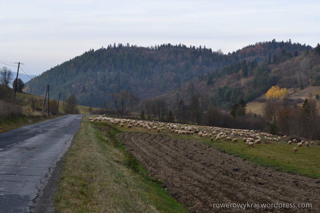 Od Czerwonego Klasztoru pniemy się lekko w górę. Taka delikatna, niewidoczna dla oka wspinaczka. Po lewej stronie Haligowskie Skały przyciągają naszą uwagę. To obszar ochrony ścisłej. Ich wschodnimi i północnymi obrzeżami prowadzi zielony szlak turystyczny z Haligowców przez przełęcz Pod Płaśniami do Leśnicy. My jedziemy dalej do Wielkiego Lipnika, by potem obrać kierunek na Leśnicę. Po obu stronach drogi na łąkach pasą się owce a raczej ich setki, a może nawet tysiące. Choć krajobraz jest miły dla oka, to jazda staje się nieco monotonna. Kręcimy i jedziemy mozolnie. Za Wielkim Lipnikiem, po pokonaniu już kilku dobrych kilometrów pod górę, zaczyna się dopiero jazda wzwyż. Przed nami Przełęcz pod Tokarnią (słowac. Lesnické sedlo).