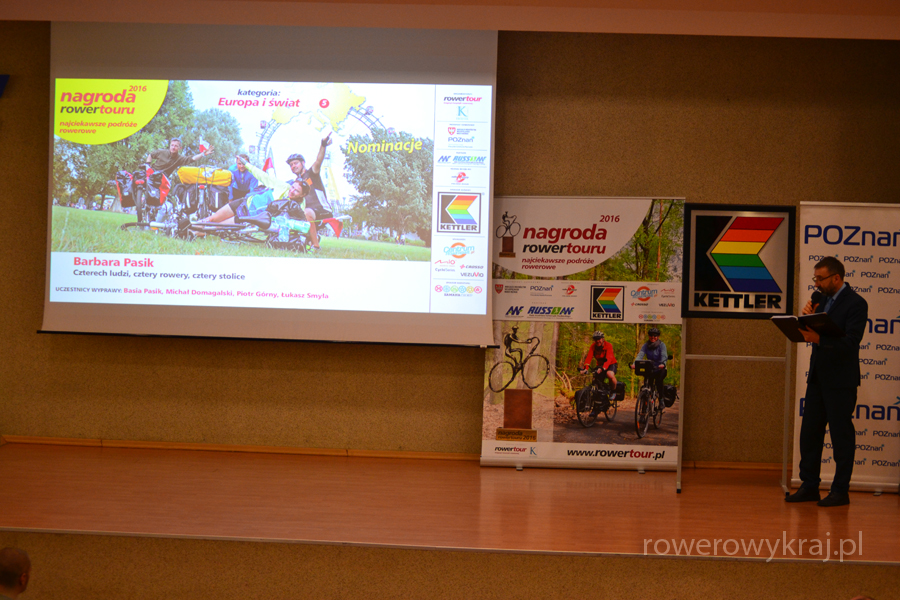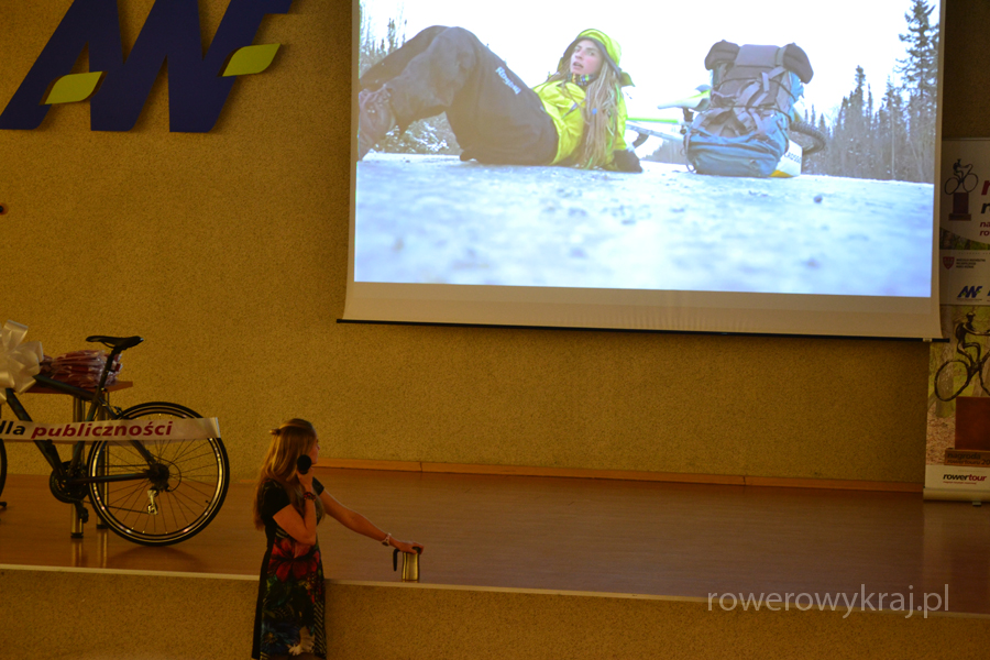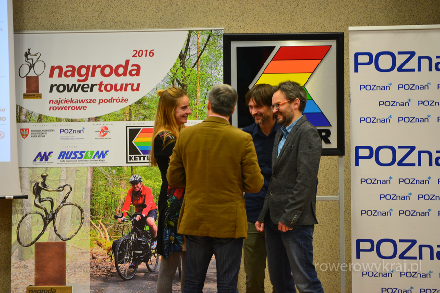 Po porannych przebieżkach ulicami Poznania, po przechadzkach korytarzami Starego Browaru, w którym obecnie mieści się centrum handlowe, po najgorszym w życiu obiedzie w barze mlecznym na ulicy Szkolnej, gnamy na galę konkursu Nagrody Rowertouru 2016. Już w uczelnianym korytarzu rozpoznaję redaktor Izabelę Dachtera-Walędziak, wizerunek której dotychczas znany był mi jedynie z fotografii na łamach czasopisma. Na auli sporo miejsc jest już zajętych, ale jeszcze na znacznej można usadzać swoje cztery litery. Rozglądam się za osobami, które zaglądają czasem tutaj zostawiając swój ślad w postaci komentarza czy maila. Nie rozpoznaję jednak nikogo. Tylko pojawiający się na scenie Sławomir Bajew rozpoczyna galę z takim samym kunsztem, jaki odnaleźć możemy w jego felietonach. Potem gdzieś przemyka drobniutka sylwetka Kamili Kielar, która podczas gali opowie o swojej rowerowej przygodzie na zmarzniętych ziemiach Jukonu. Ale po kolei…
