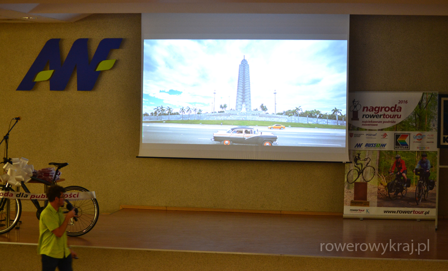 Ostatnie nagrody w ostatniej kategorii wycieczki z dziećmi rozdane. Mimo to gorąca atmosfera trwa nadal, bo na scenie pojawia się Jakub Rybicki z prezentacją „Rowerowa Kuba”. A wyspa potrafi być gorąca, czemu wyraz oddają melodyczne, latynoskie dźwięki stanowiące muzyczne tło prezentacji.