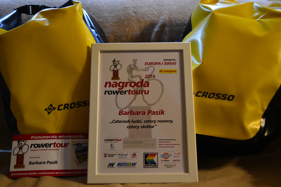 Kiedy wzięłam do ręki styczniowy numer Rowertouru nie spodziewałam się, że ujrzę w nim swoje nazwisko pośród piątki nominowanych do corocznej nagrody czasopisma. Było tam jednak! Czarna farba drukarska rozprysła się po kartach gazety malując kształtne litery, które złożone jedna przy drugiej przedstawiały moją godność. Niżej nadany przeze mnie tytuł wyprawy „Czterech ludzi, cztery rowery, cztery stolice”. To chyba nie sen? Potem odezwała się redakcja. Tak! Zostałam nominowana do Nagrody Rowertouru na najciekawszą relację z rowerowych wojaży w kategorii Europa i Świat! Cóż było robić? Układać powoli plan wyjazdu do Poznania na Galę Rowertouru, która odbyła się 28 stycznia 2017r.
