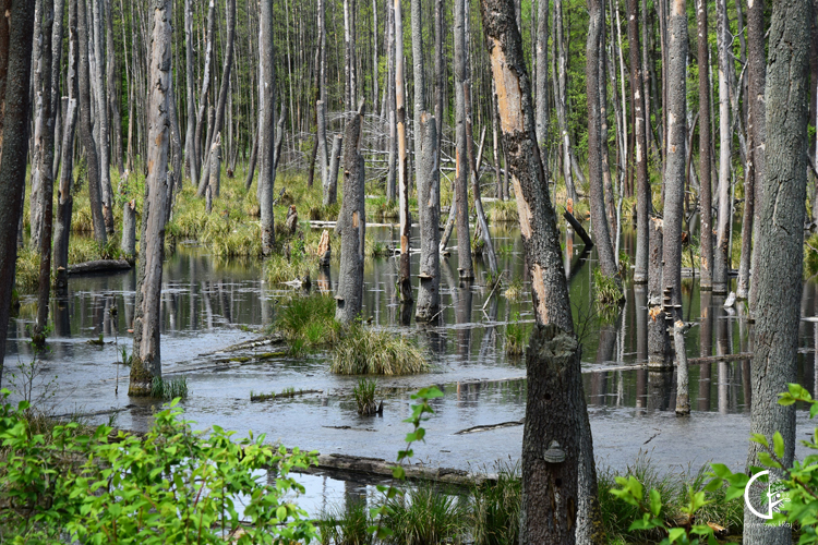 Ciemne chmury zawisły nad Spalskim Parkiem Krajobrazowym. Korony drzew szarpie w nierównym rytmie porywisty wiatr. Słabsze w naturze witki i gałązki lądują przed koła naszych rowerów. Granat nieba zasnuł okolicę obniżając swój pułap z każdą kolejną minutą.