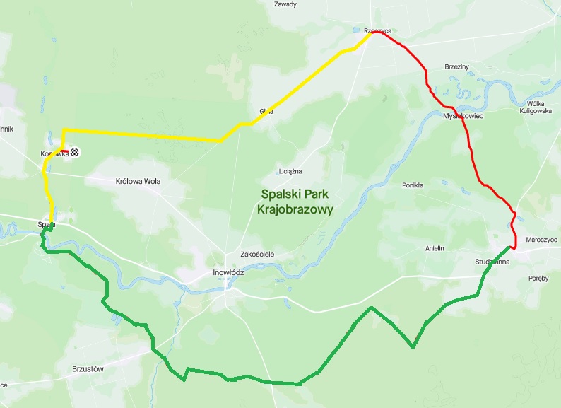 mapa naszej trasy z oznaczeniem szlaków, jakimi poruszaliśmy się żółty: Szlak Carskich Łowów, zielony: Trakt przez Puszczę Pilicką, czerwona linia: poza wyznaoczonym w terenie szlakiem