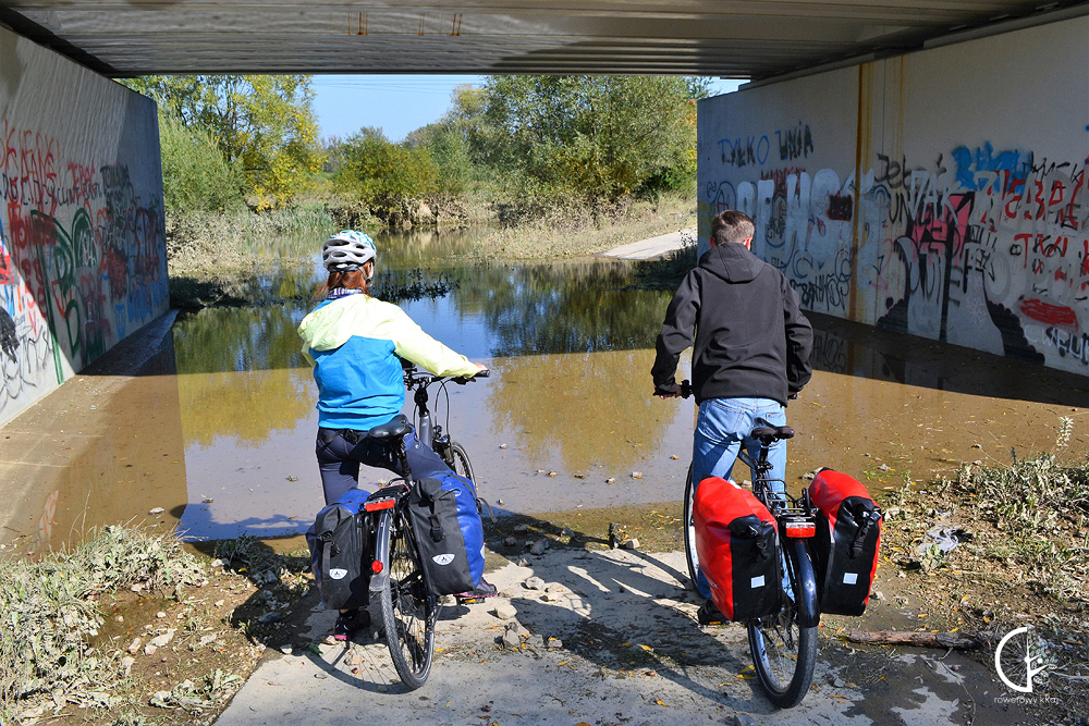 Pierwsza niedogodność pojawia się na przejeździe pod torami kolejowymi. Badamy wzrokiem stan wody i naniesionego błota i nie ryzykujemy przeprawy na kołach. Na torach stoi pociąg, więc o przeprawie górą nie ma co mówić. Niektórzy czekają, aż lokomotywa ruszy ociężale i pociągnie skład. Nam szkoda czasu, bo słońce się obniża, a późno wrześniowy dzień szybko chyli się ku zachodowi. My musimy zaś dotrzeć do Krakowa, gdzie zarezerwowaliśmy nocleg.