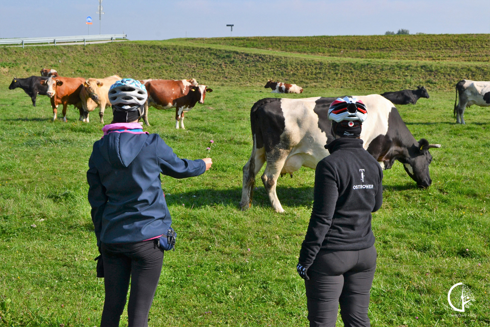 Nudę przełamujemy starając się dotrzeć do miejsca, w którym Dunajec wpada do Wisły. Chodzenie z rowerami po chaszczach, które jeszcze kilka dni temu były zatopione w błocie, nie jest najprostszą sprawą. Nawet krowa patrzy na nas spod byka, kiedy lekceważąco wchodzimy na jej terytorium. Dotarcie do samego ujścia nie powodzi się z uwagi na szlam, błoto i śliską maź pozostałą po podniesionym stanie rzek. Udaje mi się nie zaliczyć gleby, ale z powrotem niosę ze sobą kilka kilogramów błota na podeszwach.