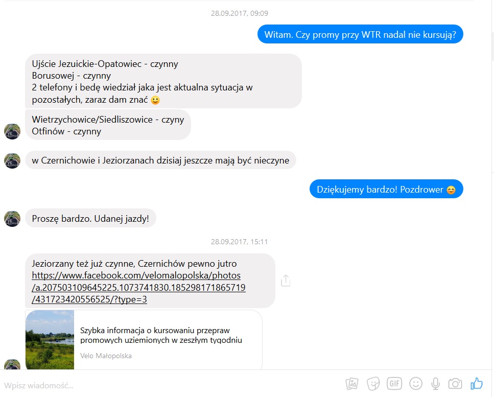 Wjeżdżamy na asfaltową ścieżkę rowerową i od razu uśmiechy rysują się na twarzy. Tablice pionowe oraz oznakowania poziome szlaku potwierdzają, że jesteśmy na właściwej drodze. Naniesiony muł i mokre na kilka metrów elewacje domów przypominają, że kilka dni temu w regionie tym miały miejsce podtopienia. My jednak cieszymy się wygodną jazdą prowadzącą nas wstęgą wzdłuż Soły, która wije się pośród zielonych drzew Łęgu Błonia. Mając cały czas na uwadze komunikaty z fejsbukowej strony Velo Małopolska o możliwych nieprzejezdnych odcinkach szlaku i nie kursujących niektórych promach, weryfikujemy te informacje kontaktując się przez messenger. Odpowiedzi pojawiają się błyskawicznie, co pozwala nam na realizację założonych planów.