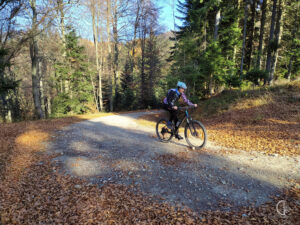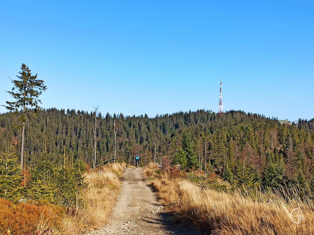 Na wysokości ok 1000 m n.p.m. nasza droga łączy się z pieszym niebieskim, a potem również zielonym szlakiem na Przehybę. Teraz już grzbietem, bez znacznych zmian wysokości, jazda staje się mniej wymagająca. Na horyzoncie widać już nadajnik na Przehybie.