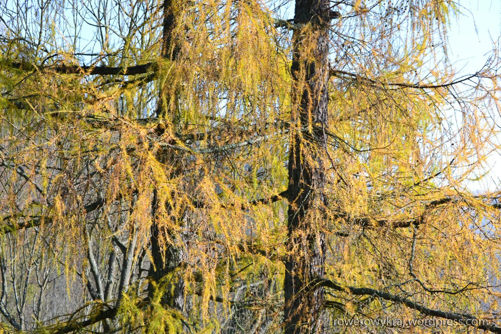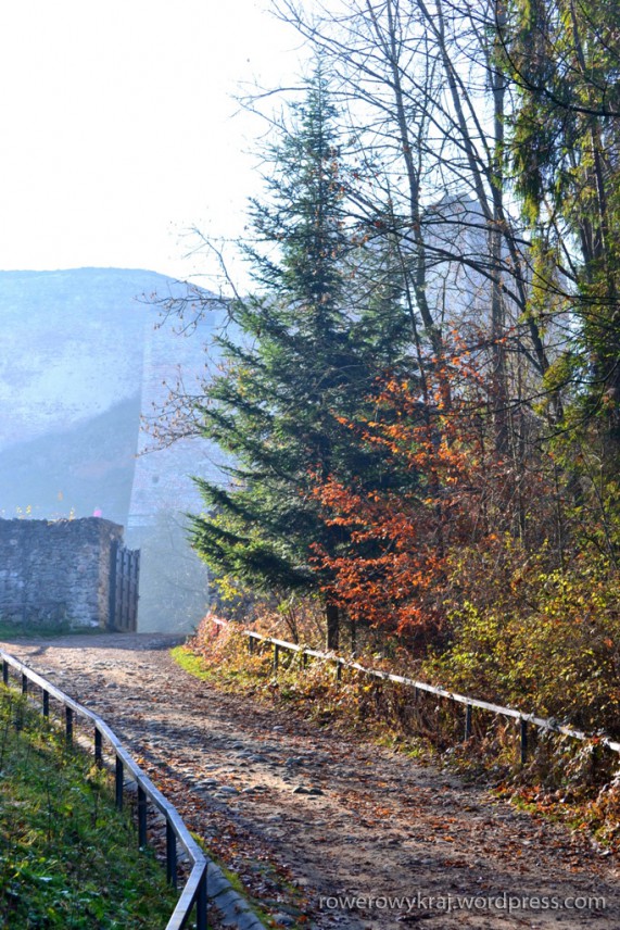 Mimo mglistego powietrza, słońce przedziera się dość mocno przez jego ociężałe drobinki kropel. Z parkingu wiedzie nas w dół asfaltowa droga. Mimo znakomitej aury, wokół żadnych śladów turystycznego życia. W pawilonie pełniącym także funkcję kasy, nie ma także żywego ducha. Na parkingu nawet nieożywionego auta nie widać, poza naszym. Radośni z otaczającej nas ciszy, przerywanej jedynie świergotem ptaków, które postanowiły zostać na miejscu i nadać nieco wiosennego tonu oraz tuptaniem wiewiórki, pomykającej po konarach drzewa, miarowym tempem idziemy na zamek. Rześkie powietrze spowite zapachem przydrożnych świerków wdziera się w nozdrza i wprawia nas w dobry nastrój. Po kilku minutkach marszu, ścieżka lekko skręca i wiedzie w górę.