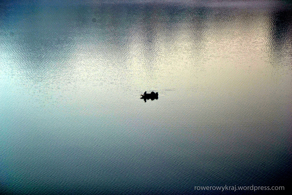 Na tafli jeziora zaś, dostrzegamy maleńką niczym łupina orzecha łódkę. To pewnie wędkarze wypuścili się na łowy. Ich sylwetki można ledwo dostrzec we wszechogarniającym mlecznym powietrzu.